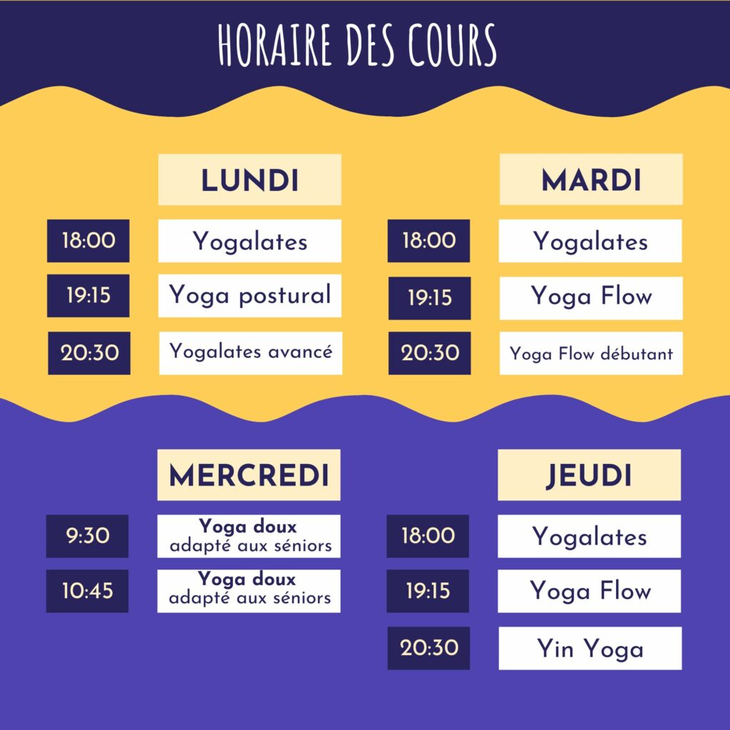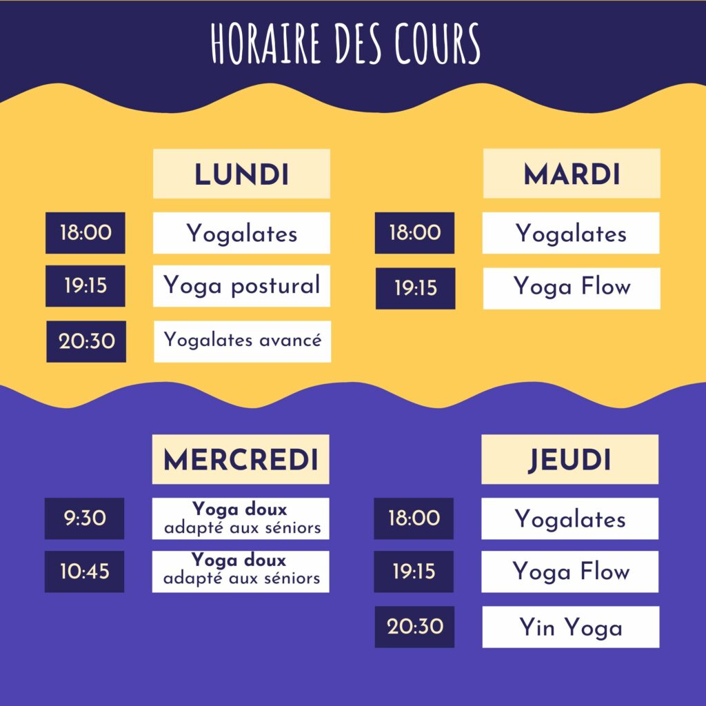 Nous proposons des cours de Yogalates (Yoga + Pilates), de Yoga Flow (Vinyasa), de Yin Yoga et de Yoga postural (Hatha). Pour consulter le programme complet des cours,